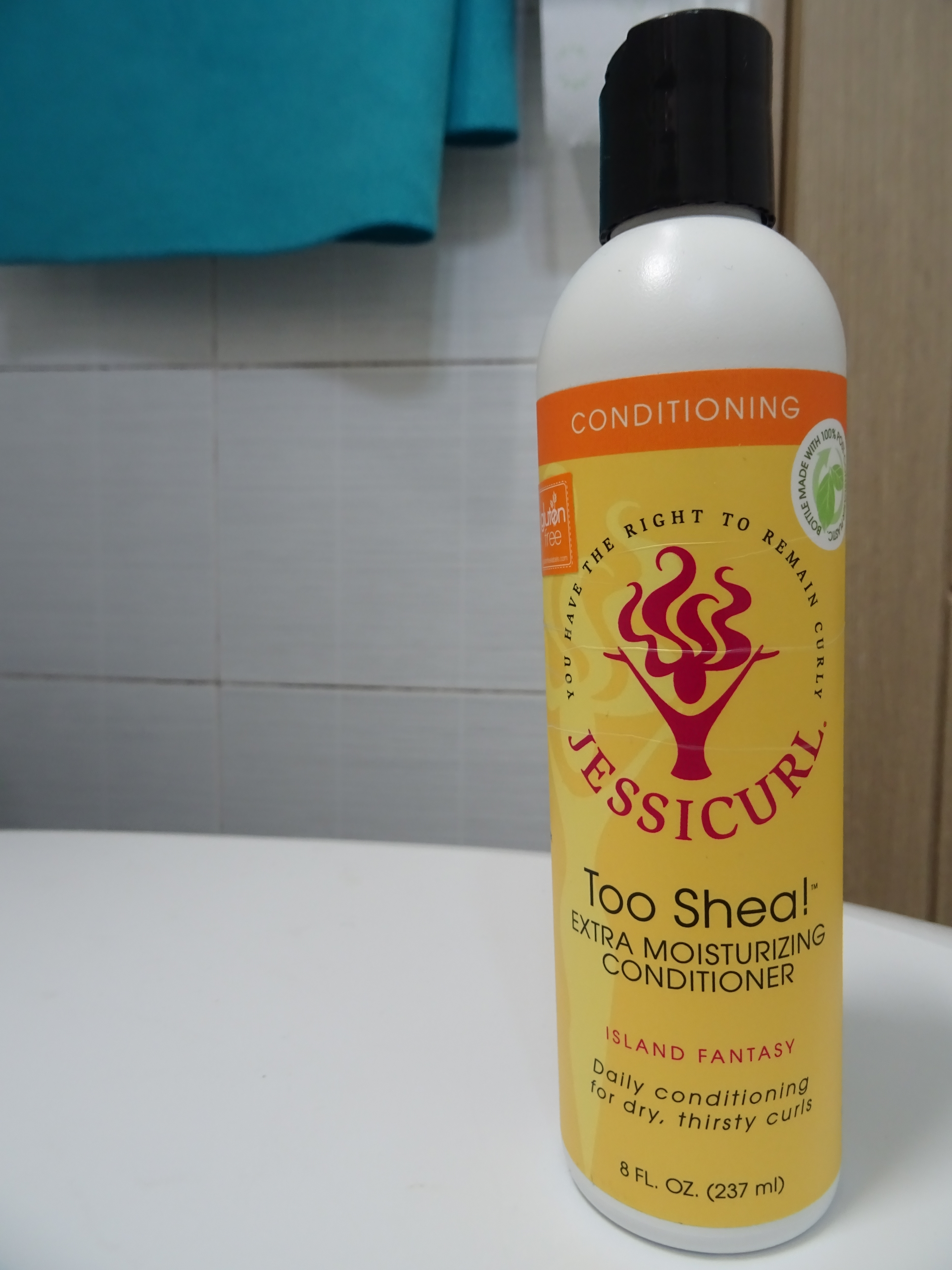 Next, I flip my hair forward and apply my regular leave in conditioner. I’m currently using Too Shea! Extra Moisturising Conditioner from JessiCurl.