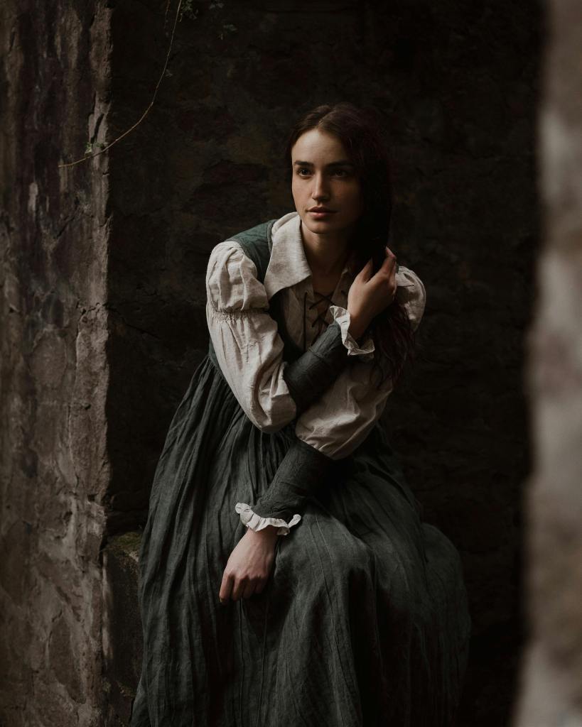 Her hair was deep shade of auburn which she wore plainly day to day, but which she tied up when she was working and creating. She wore a simple garment, which she had dyed green from various plants and minerals she had foraged and tied a cloth belt at the waist which served as a way to carry jars, tubes and other ingredients she found when she was collecting supplies.